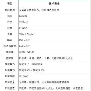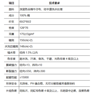 采購如圖深藍色全棉牛仔布,經中漂洗水處理,2款面料規格如圖,各5000米