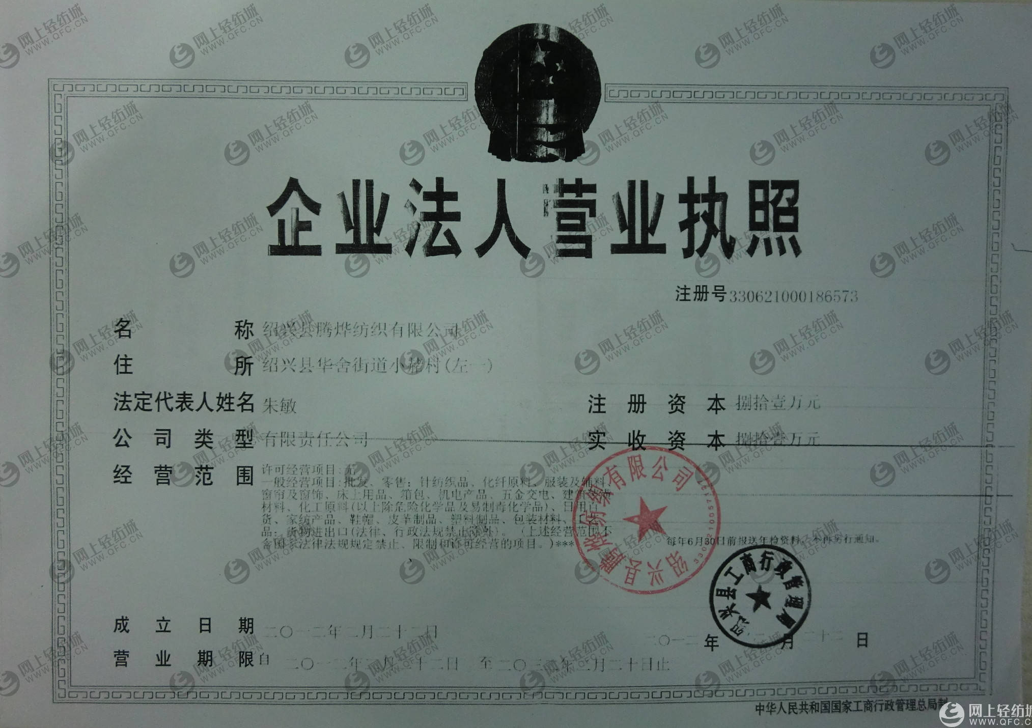| 統(tǒng)一社會信用代碼/營業(yè)執(zhí)照注冊號: | 330621000186573 | 名稱: | 紹興縣騰燁紡織有限公司 |