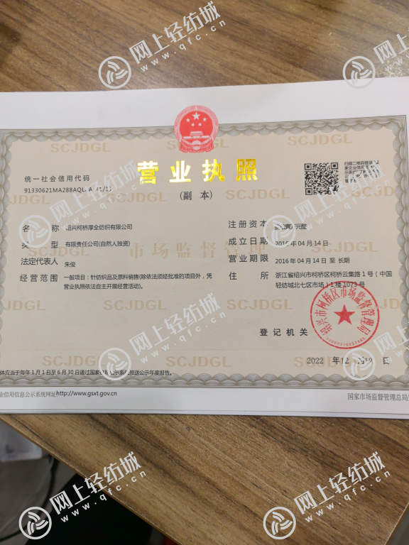 統一社會信用代碼/營業執照注冊號: 91330621MA288AQL6A 名稱: 紹興柯橋厚全紡織有限公司