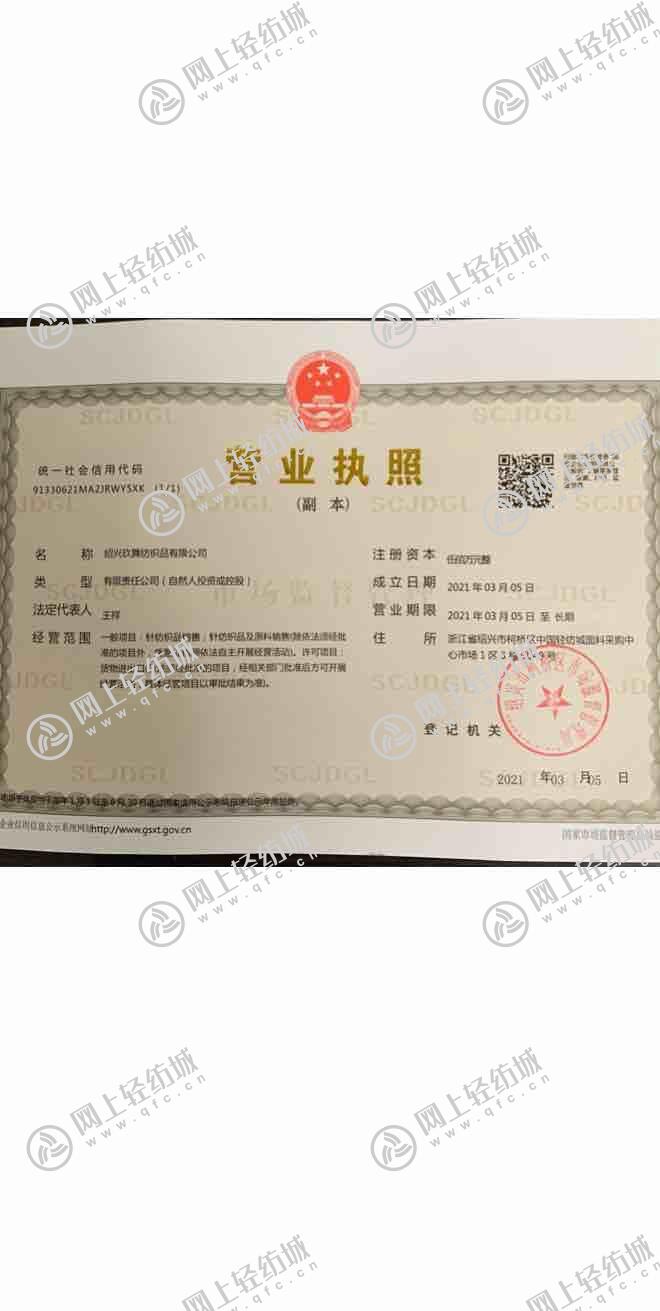 統一社會信用代碼/營業執照注冊號: 91330621MA2JRWY5XK 名稱: 紹興玖舞紡織品有限公司