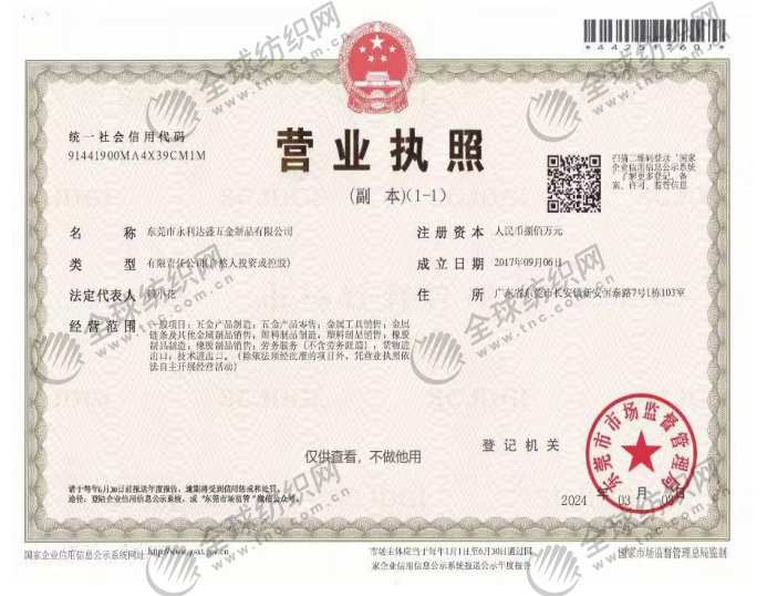 | 統(tǒng)一社會(huì)信用代碼/營(yíng)業(yè)執(zhí)照注冊(cè)號(hào): | 91441900MA4X39CM1M | 名稱: | 東莞市永利達(dá)盛五金制品有限公司 |