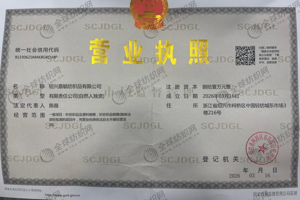 統一社會信用代碼/營業執照注冊號: 91330621MAK8GKCU4F 名稱: 紹興嘉毓紡織品有限公司