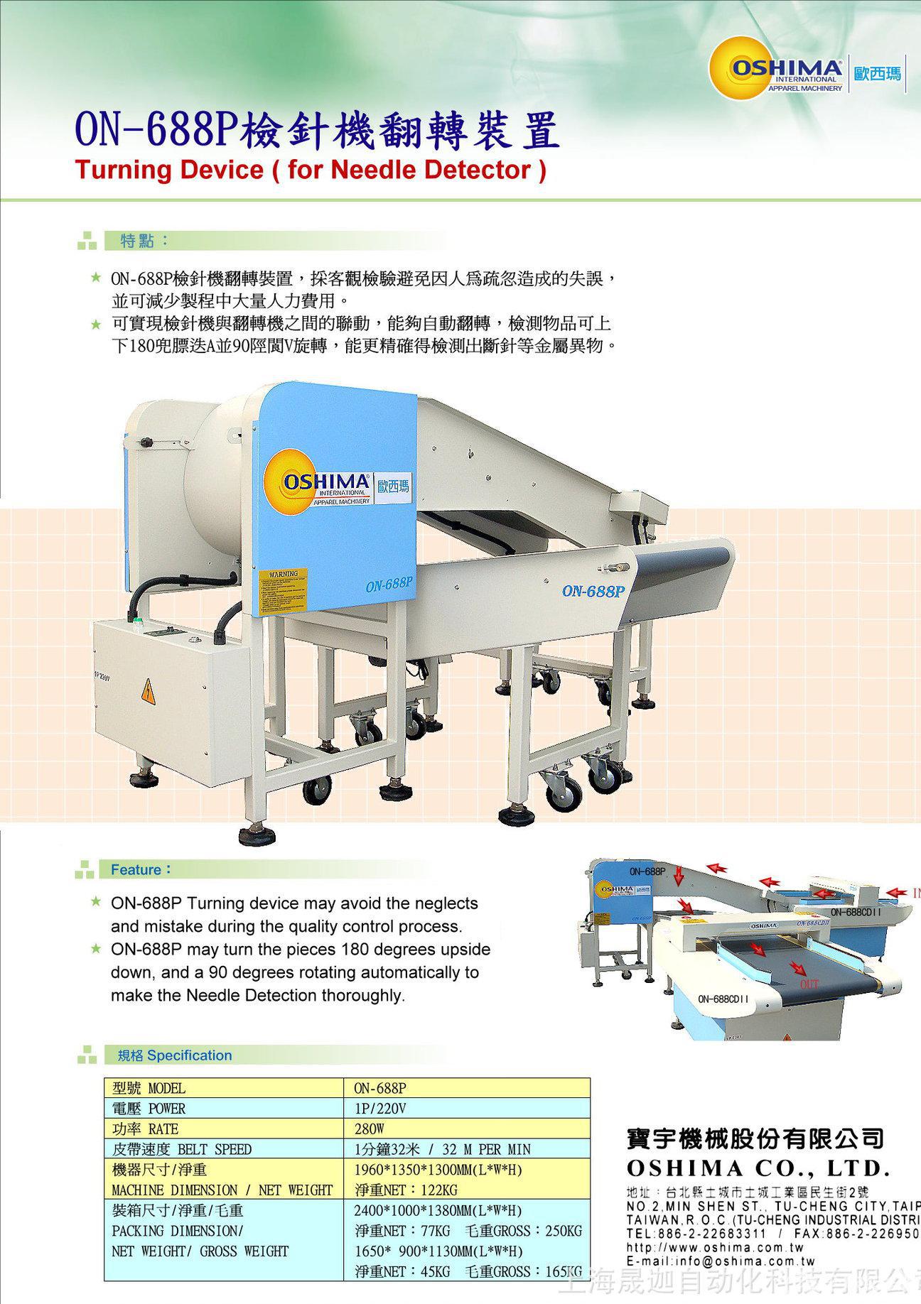 • on-688p檢針機翻轉裝置,采客觀檢驗避免因人為疏忽造成的失誤,并可減少制程中大量人力費用。